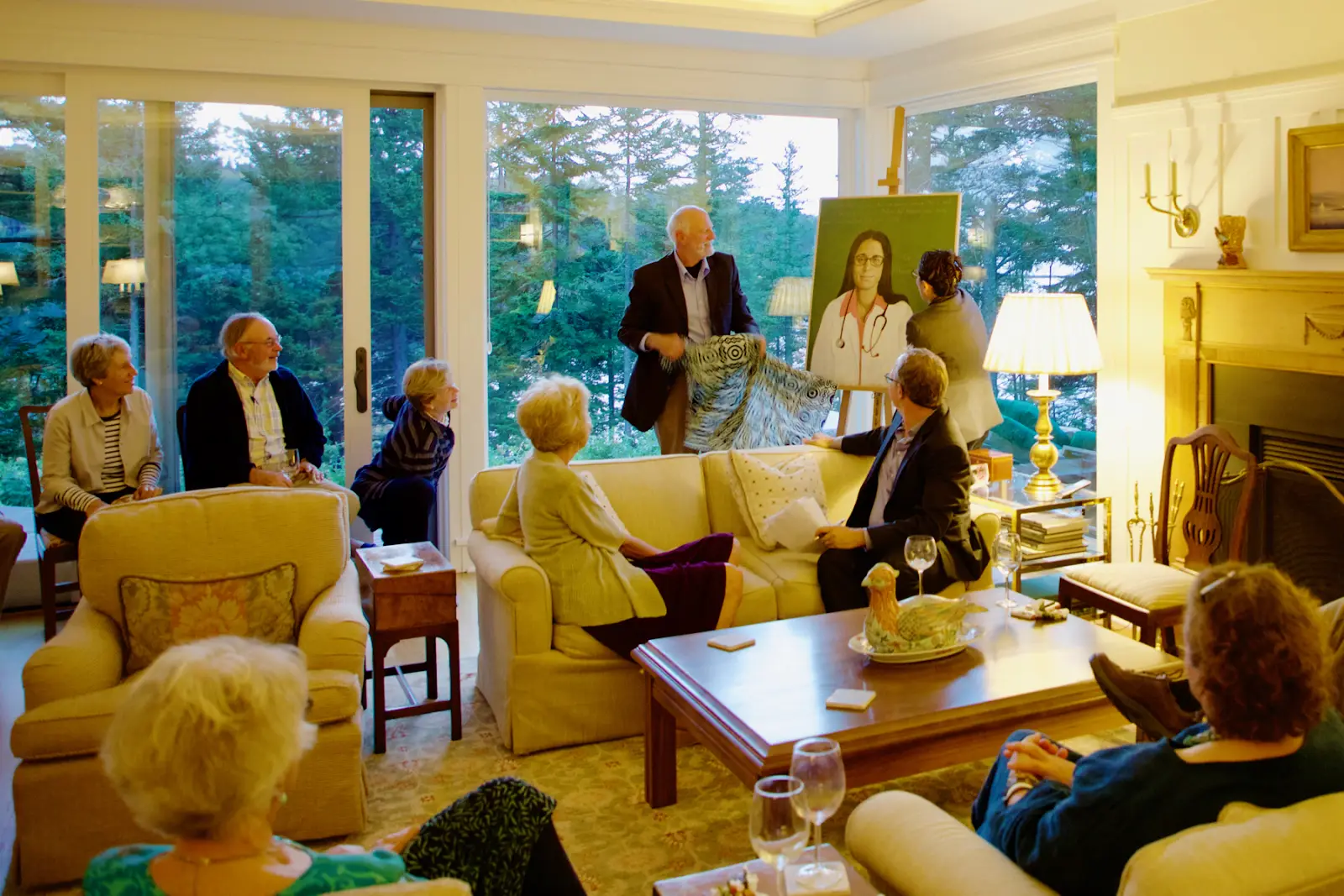 On September 9th we held our first fundraiser at Sally and Charlie Stone’s beautiful home in Brooksville, Maine. (You can still contribute by clicking the “DONATE” button on our website!) The event featured the unveiling of Rob’s portrait of Dr. Mona Hanna-Attisha, the pediatrician from Flint, Michigan, who blew the whistle on the lead in Flint’s water and has been leading remediation efforts. Dr. Mona told her inspiring story to the guests. Then high school student Nicholas Parker from Hampden, whose piano composition as an 8th grader in reaction to the Samantha Smith story was the inspiration for the Samantha Smith Challenge, talked about what AWTT meant to him and played his music. Composer Mary Anne Driscoll from Belfast, who has been setting all of the AWTT portrait quotes to music, sang Dr. Mona’s quote.