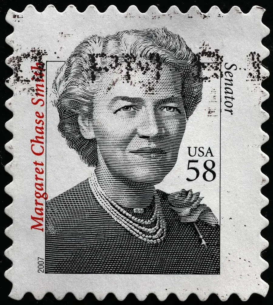 Margaret Chase Smith was born and grew up in Skowhegan, Maine. Unable to afford a college education, she held jobs as a teacher, telephone operator, newspaper circulation manager and executive at a textile mill. She founded the local Business and Professional Women’s Club and became its president. In 1936, when her husband Clyde was elected to the US House of Representatives, she accompanied him to Washington as his assistant.